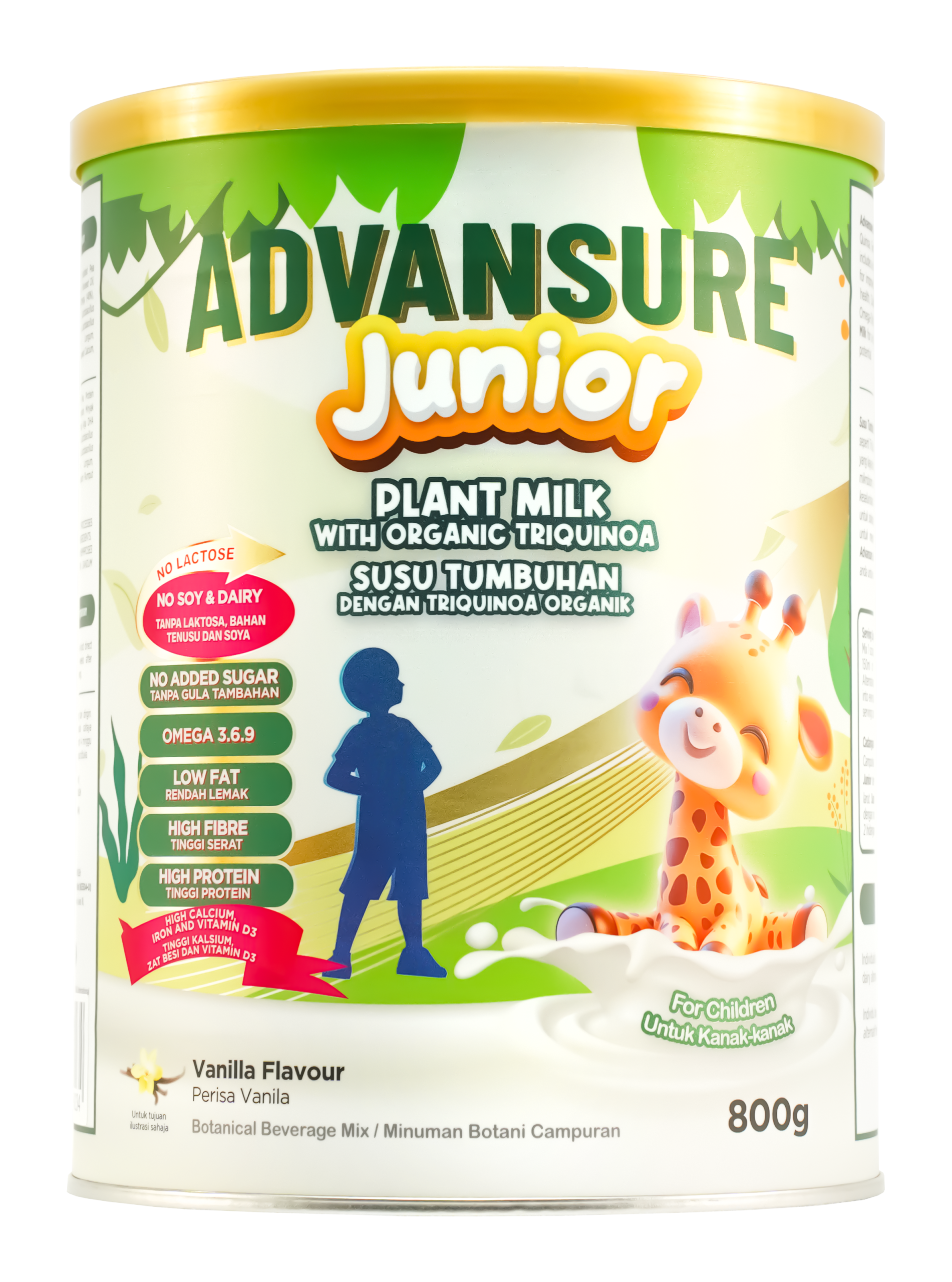 Advansure® Junior Plant Milk is a thoughtfully crafted blend of organic ingredients like Tri Quinoa, Germinated Brown Rice, and DHA Algae Omega. Our nutrient-rich formula includes a unique mix of probiotics and prebiotics, promoting a healthy gut microbiome for improved digestion and overall well-being. It contains Seaweed Calcium for bone health, as well as Phosphatidylserine and Omega-3s that aim to support cognitive function. You can rely on Advansure® Junior Plant Milk for a holistic approach to your child’s health and development to reach their full potential.