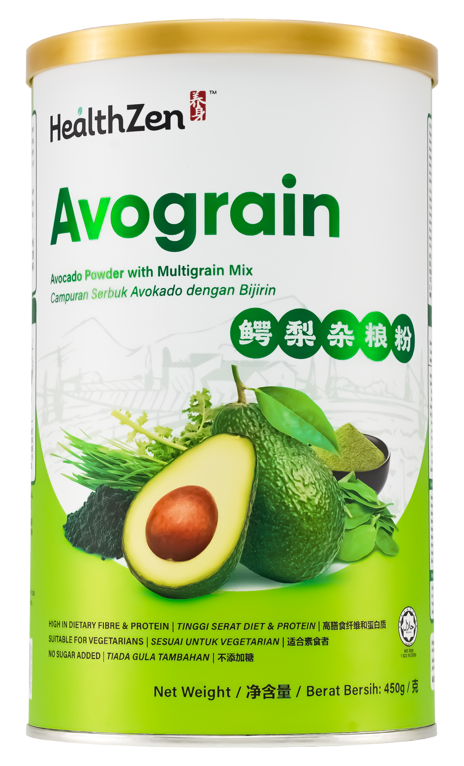 HealthZen™ Avograin diadun dengan pelbagai bijirin dan makanan hijau termasuk avokado, rumput barli, wheatgrass, spirulina, matcha, kangkung dan bayam. Ia menyediakan sumber protein, serat makanan, kalsium dan zat besi yang sangat baik. Ia padat dengan nutrien, lazat, dan mudah dibuat.
